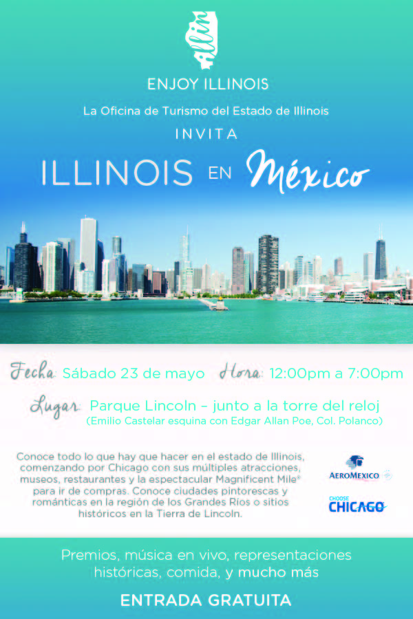 ¿Estás buscando qué hacer el fin de semana? Nosotros tenemos una gran idea para este sábado 23 de mayo. La oficina de Turismo del Estado de Illinois ofrecerá un evento totalmente gratis para conocer más sobre el Estado de Illinois en Estados Unidos. El evento se llevará a cabo en el parque Lincoln de Polanco de 12:00 am a 7:00 pm, donde tendrás la oportunidad de ganar un viaje todo pagado a Chicago, disfrutar de música en vivo, comida representativa de Illinois como la Deep Dish Pizza, probar cerveza originaria de la región, y ¡mucho más!