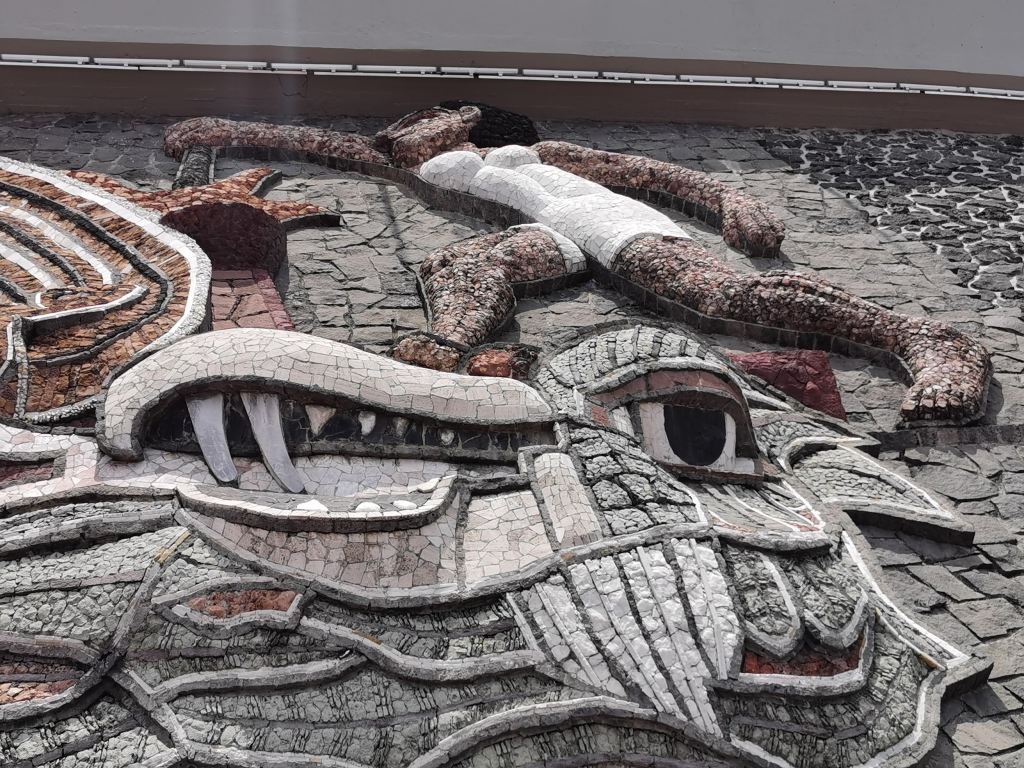 Finalmente, Leslie, Benjamín y Mauricio llevan a los visitantes hacia el otro extremo del campus, donde se encuentra el Estadio Olímpico Universitario para admirar de cerca el mural de piedra creado por Diego Rivera que está en su exterior y que representa a Quetzalcóatl y el deporte con dos atletas que encienden una llama olímpica.